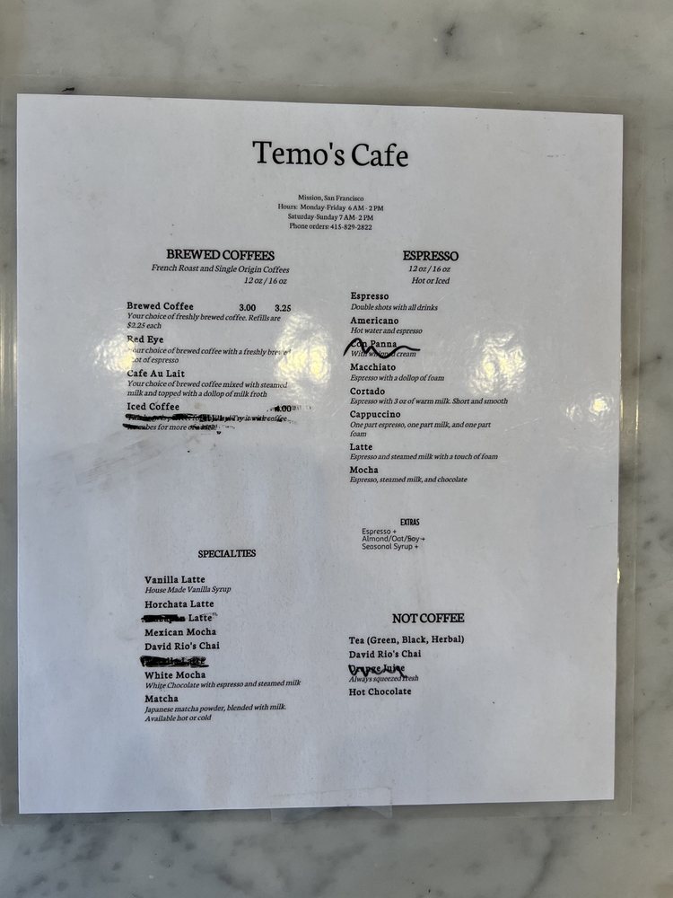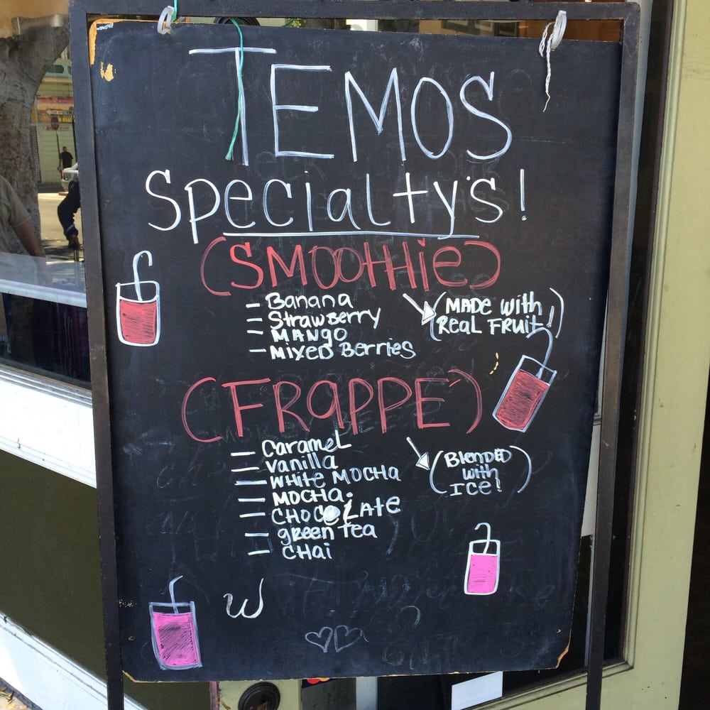 Introducing the menu at Temos Coffee, located in the heart of San Francisco's Mission district, where coffee aficionados gather to enjoy exceptional brews and delectable bites. Temos Coffee offers a variety of popular items, including homemade falafel, oatmeal, salmon and cream cheese bagel, and bagel with homemade hummus. Customers rave about the quality of the coffee beans, cozy ambiance, and friendly service. The menu also features specialty lattes like the orange blossom latte and cardamom latte, perfectly paired with pastries from Neighbor Bakehouse. Whether you're looking for a quiet spot to work or a vibrant space to catch up with friends, Temos Coffee provides the perfect setting with fast wifi, comfortable seating, and charming decor. Don't miss out on the opportunity to experience the warm hospitality and exquisite flavors that Temos Coffee has to offer.